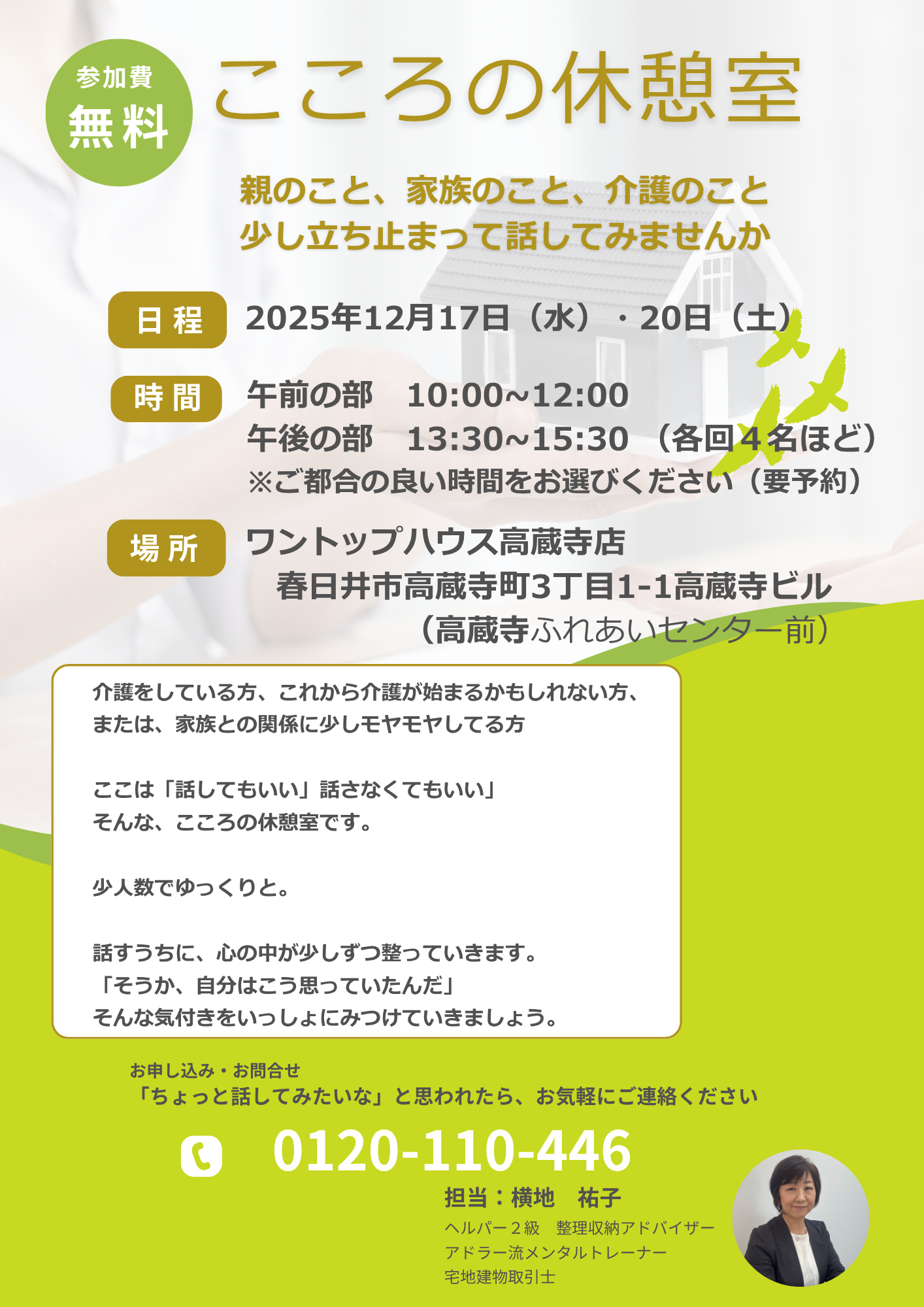 LINE・お電話から無料でお問い合わせ可能です。老人ホーム探しはワントップハウス 高蔵寺店にお任せください。